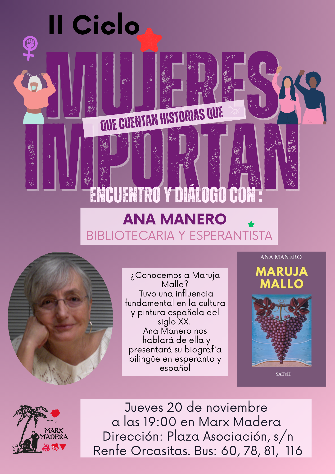 Afiŝo okaze de la prezento de la dulingva libro Maruja Mallo, verkita kaj tradukita de Ana Manero, pri la avangarda pentristino de la dudeka jarcento. La prezento okazis en la centro Marx Madera de Orcasitas, Madrido, la 20an de novembro 2025.
